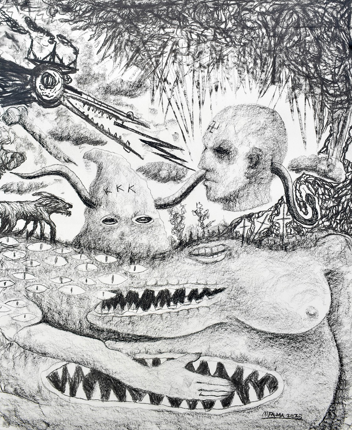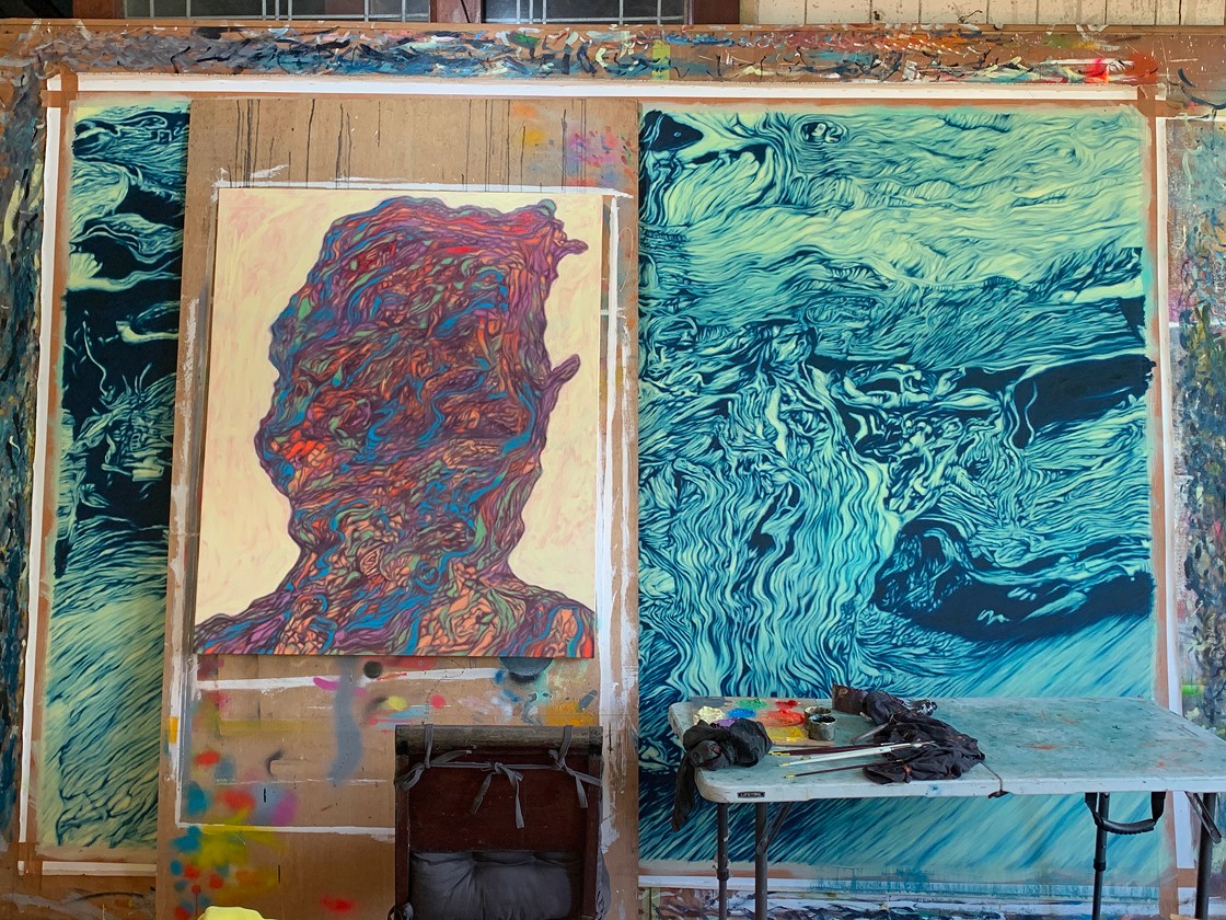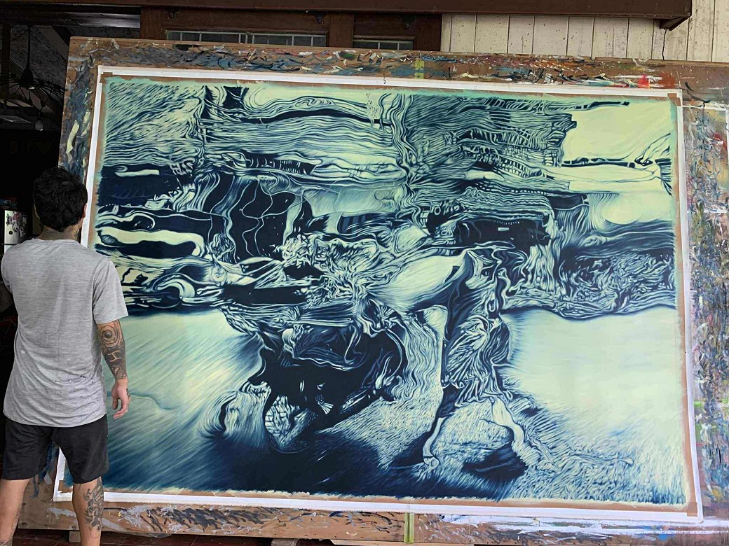 FG. The exhibition began through conversations and observations that slowly came together. More than a year before the show, I was sharing early studies with my wife while we were in San Carlos, Negros Island. At the time I was experimenting with distorted figures and layered images. Our conversation turned to sound waves and how sound might appear visually. As a musician, the idea of distortion immediately caught my interest and became the starting point for the imagery.