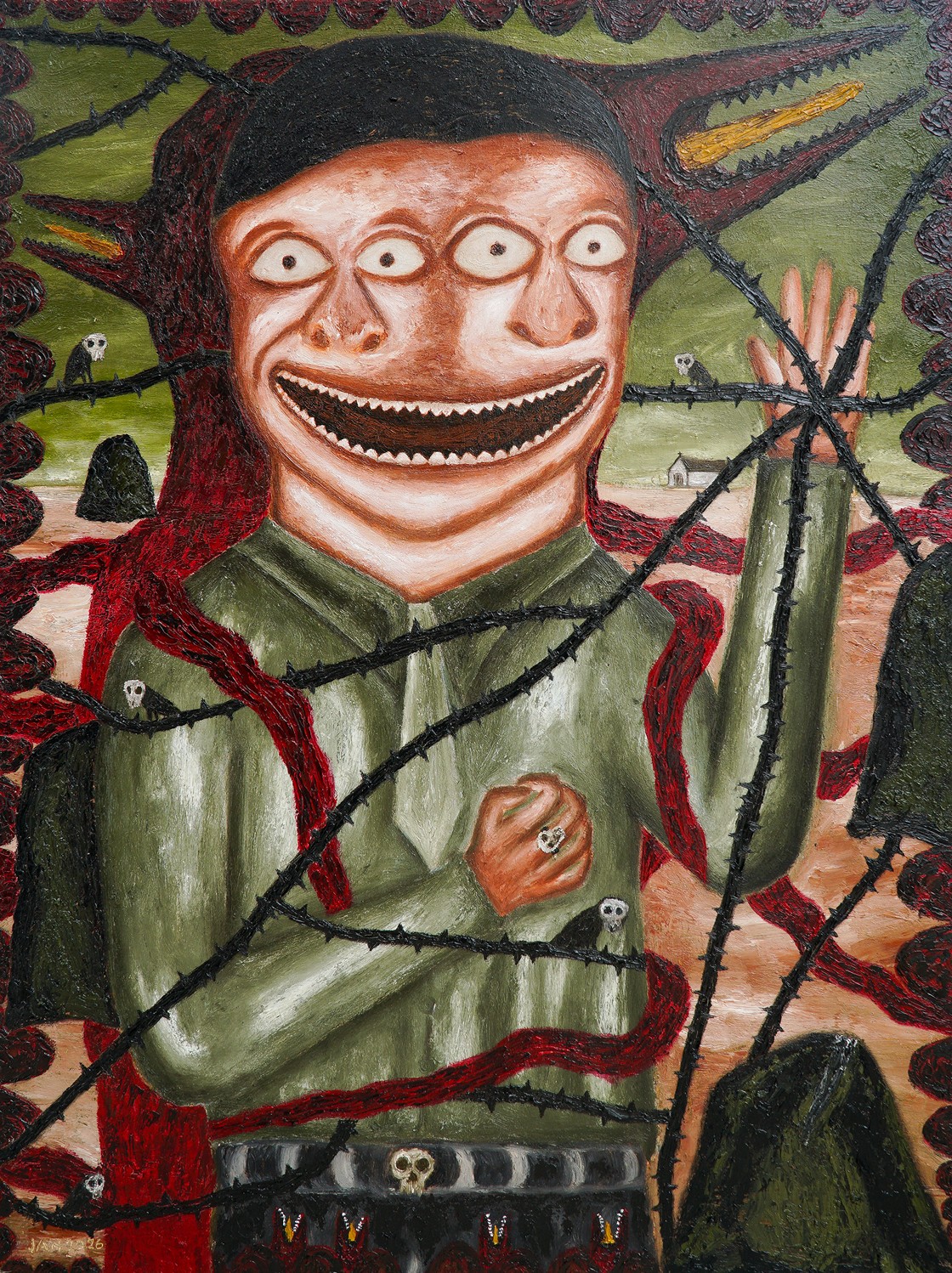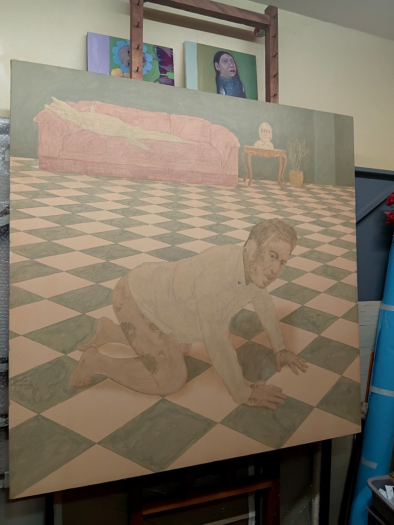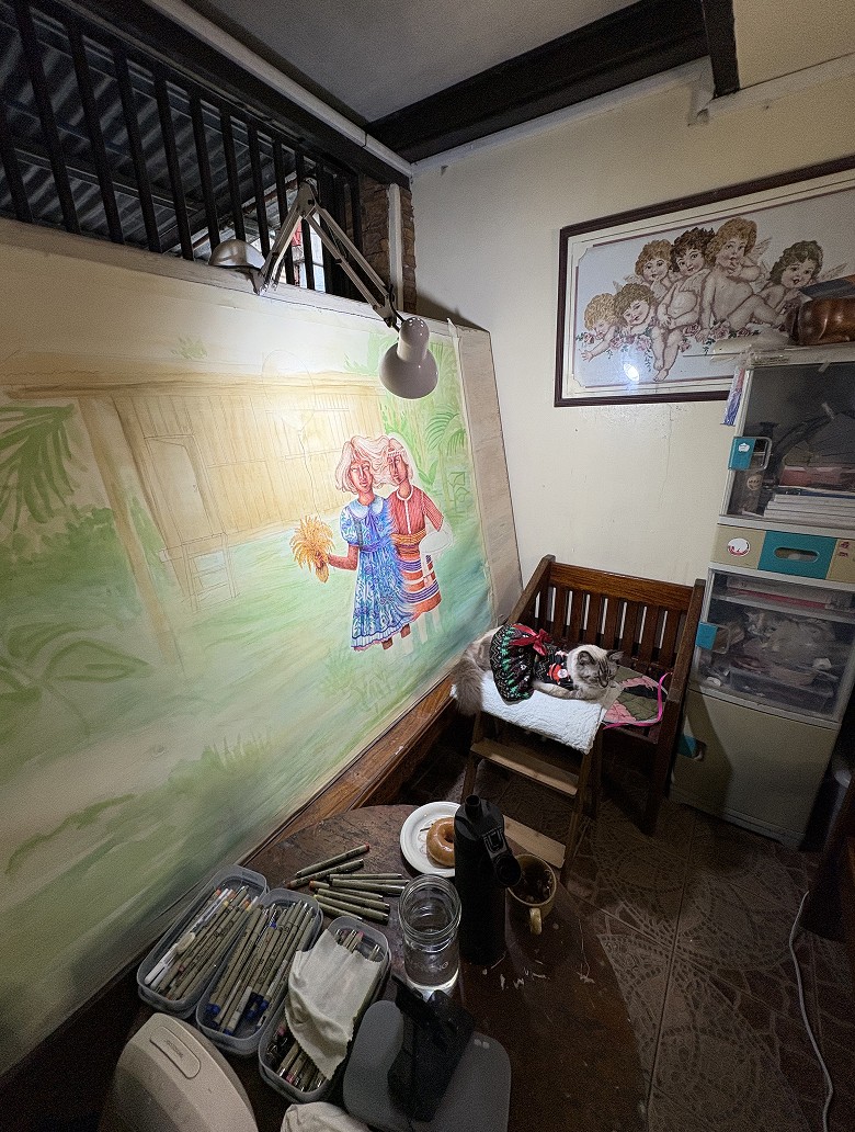 Painter Janrey Llegue offers a perspective grounded in the realities of working-class life. Originally trained in graphic design, he turned to painting during the pandemic, producing works that reflect on Philippine labour, religion, and everyday social structures.