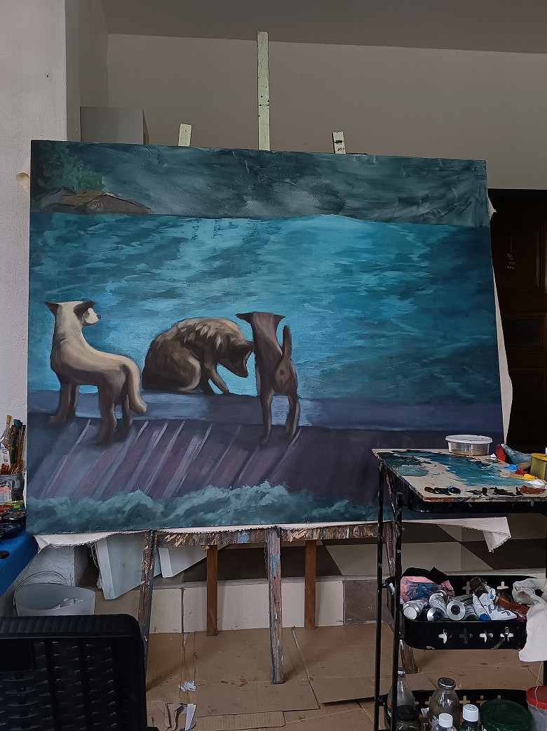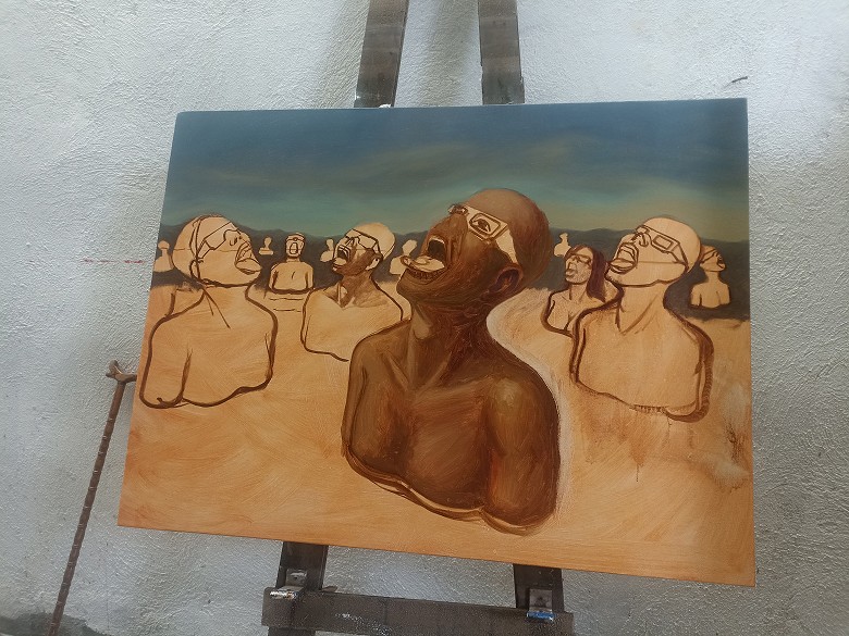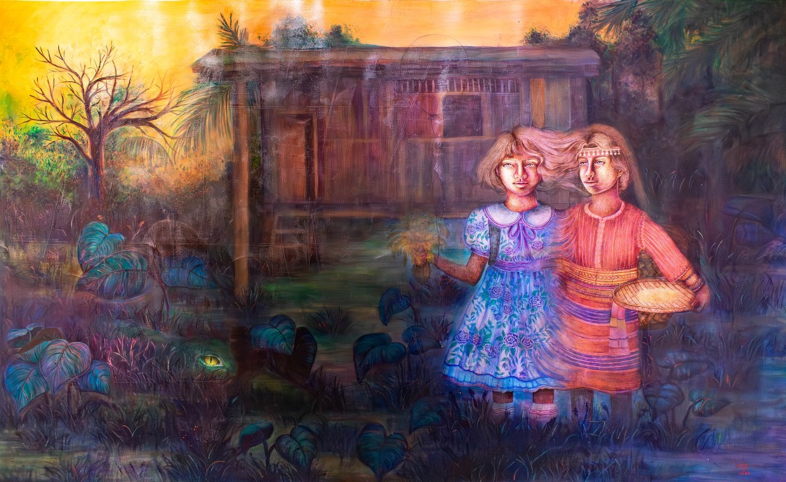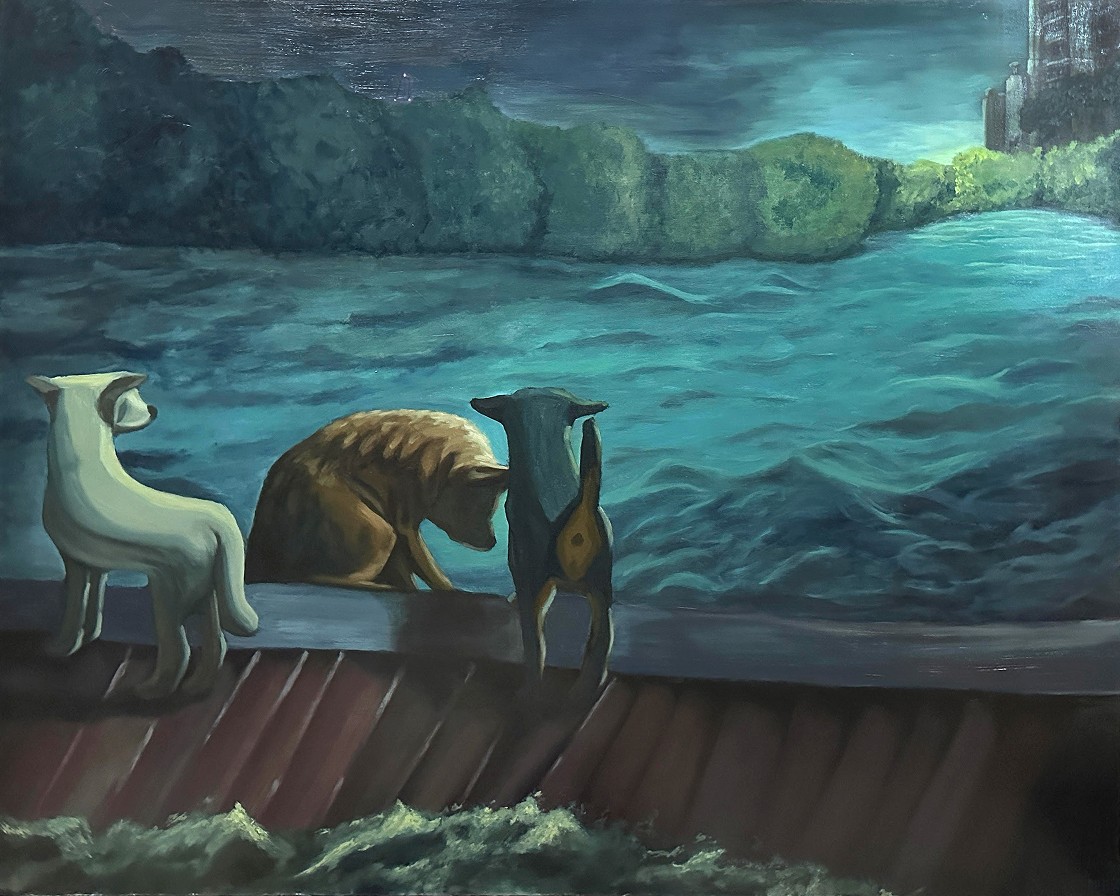 Meanwhile, self-taught artist Marrenz Antonio reflects on environmental displacement through expressive figurative scenes. His work Stranded juxtaposes a distant city skyline with three dogs seeking refuge—an image that quietly addresses the collateral damage of rapid urbanisation.