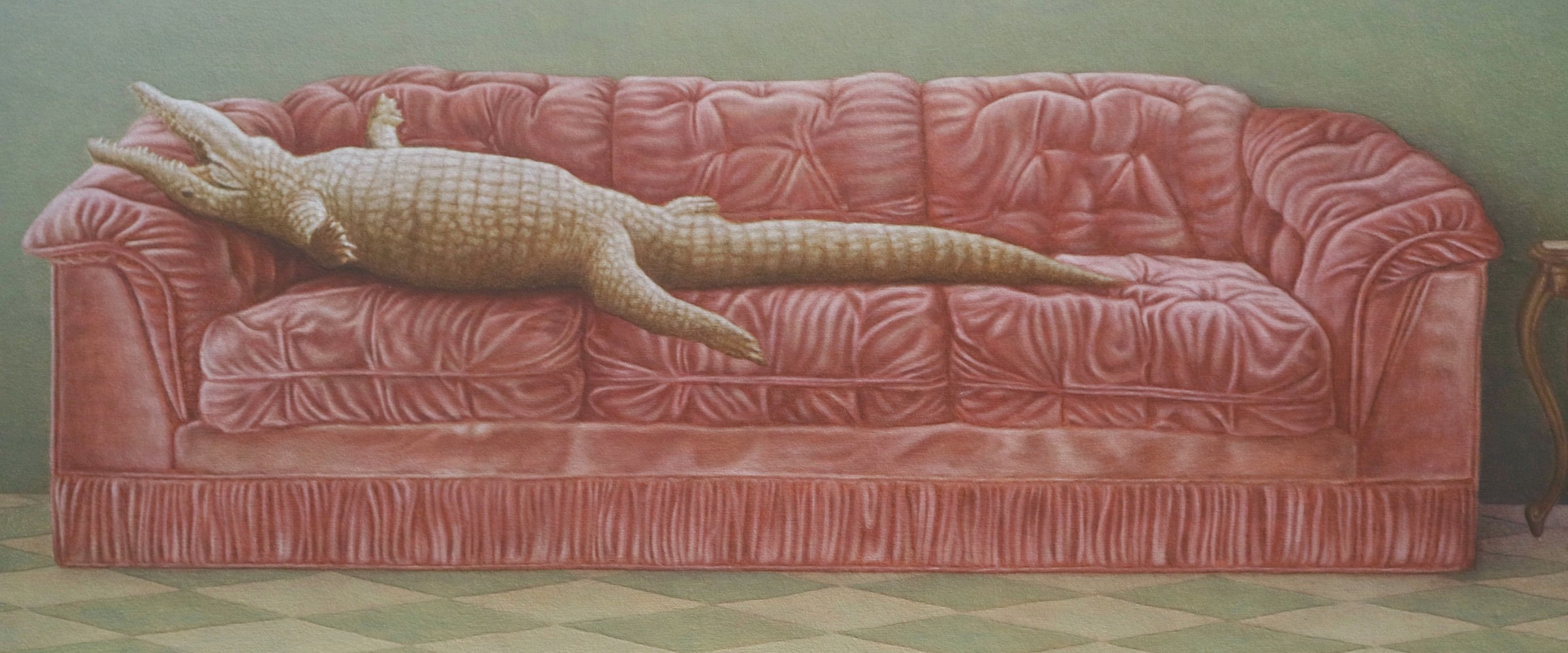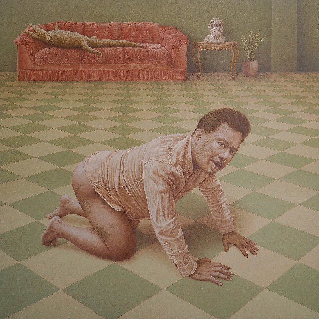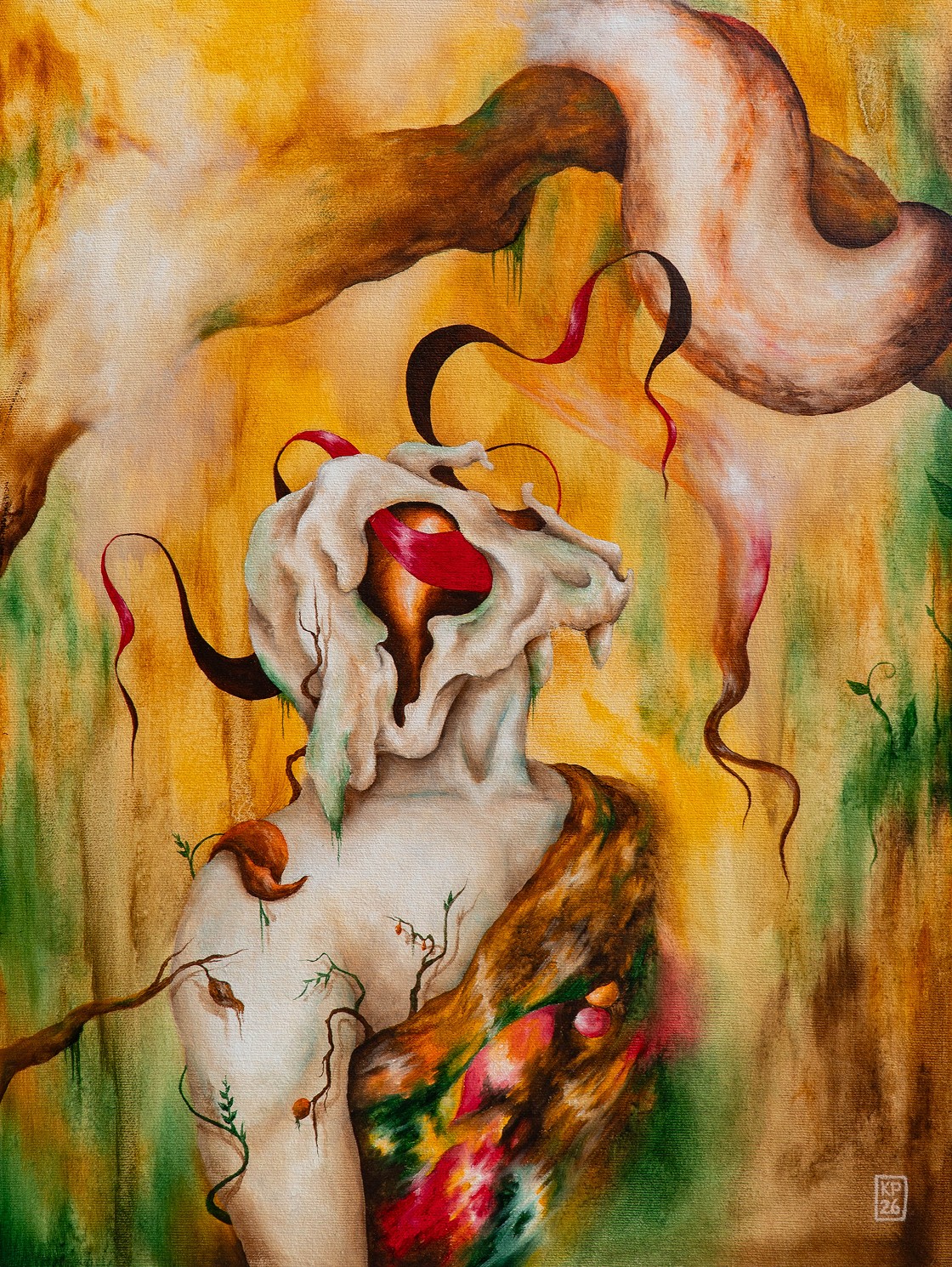 Themes of mortality and existential reflection surface in the work of Marvin Quizon, whose paintings often feature skeletal forms, decaying animals, and broken objects. His imagery confronts viewers with the fragile boundaries between life, suffering, and transformation.