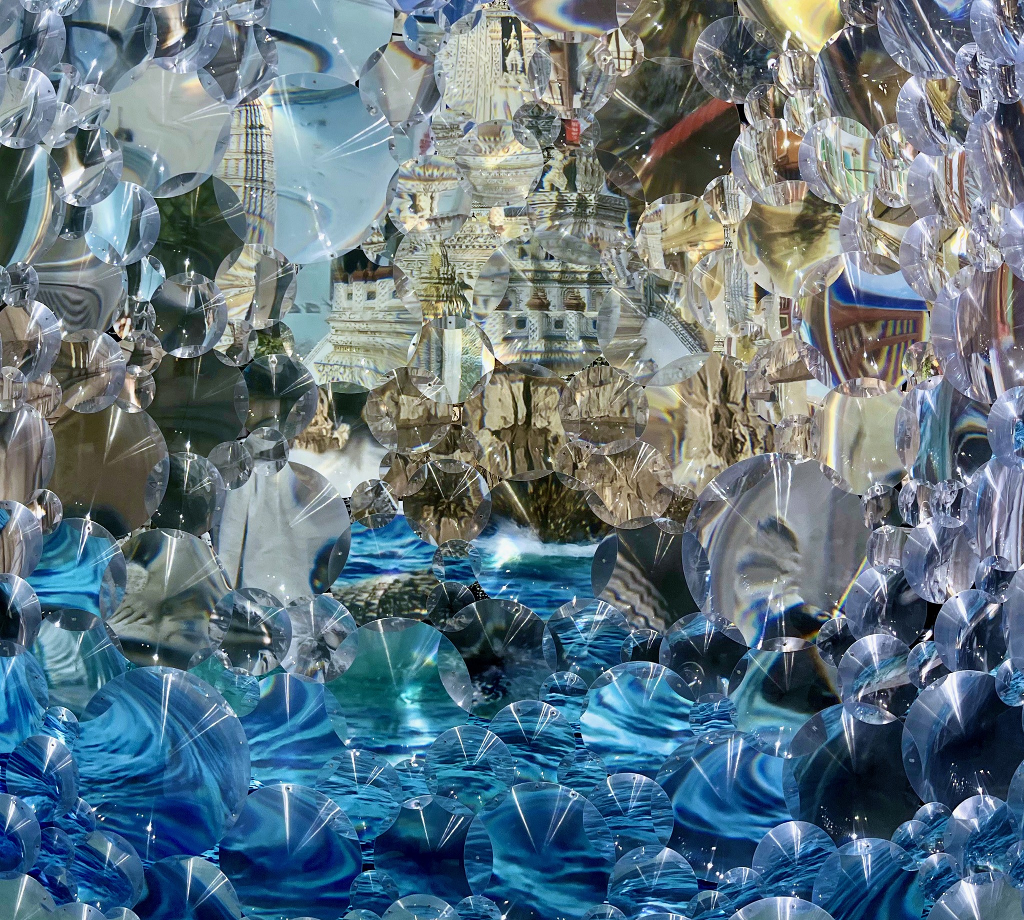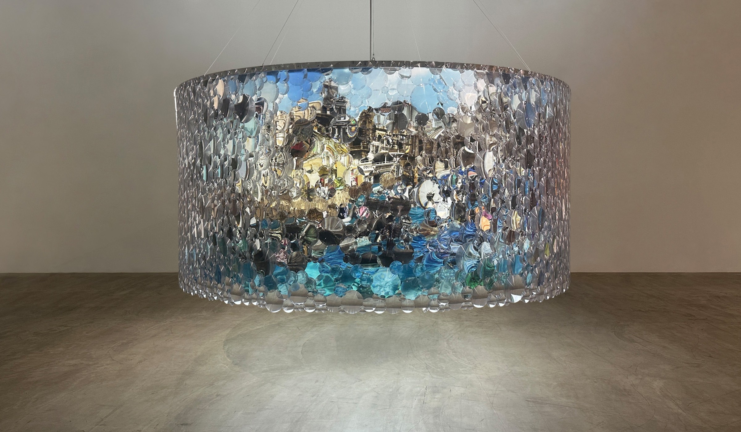 At once optical device, archive, and environment, City Lantern unfolds as a 3.6-metre-wide kinetic sculpture, in which a ten-metre photographic panorama rotates behind a dense field of Fresnel lenses. The imagery—drawn from colonial-era photographs and contemporary documentation—maps a transnational geography: from Hong Kong’s General Post Office and Tian Tan Buddha, to Manila’s Binondo Church, Beijing’s Temple of Heaven, and Singapore’s Golden Mile Complex.